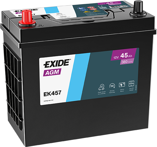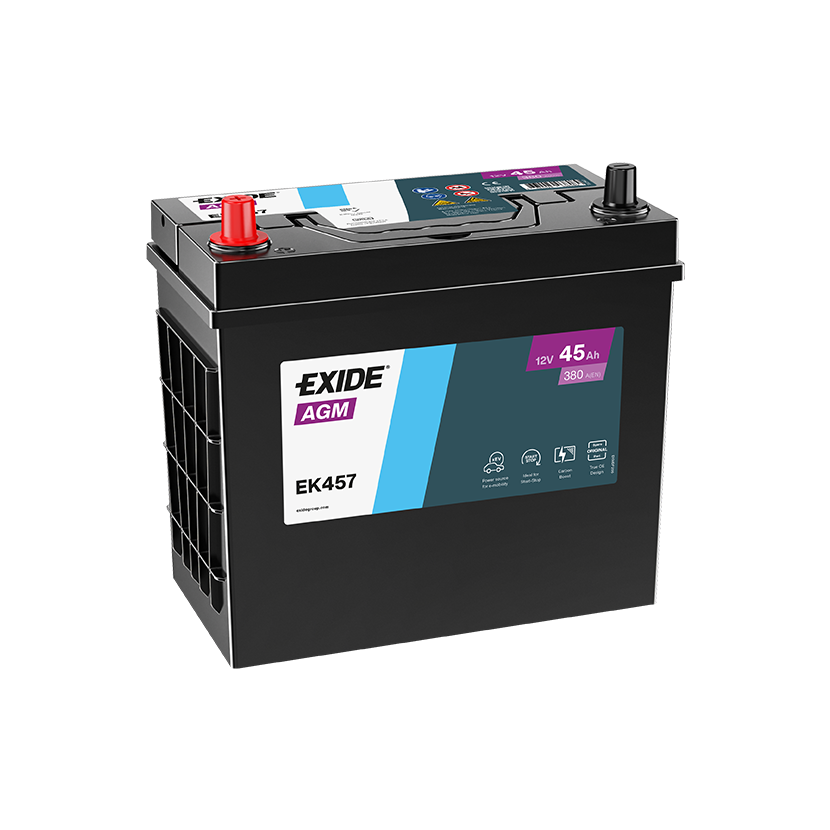 Exide EK457 AGM 12V 45Ah 380A je AGM batéria je olovo-kyselinová batéria, ktorá má 100% svojho elektrolytu nasiaknutého v GLASS-Matt separátoroch (separátory s obsahom sklenených vlákien). Je hermetická, bez možnosti úniku elektrolytu a môže byť namontovaná v akejkoľvek pozícii. (Obrátenie hore dnom sa neodporúča.) AGM batérie prešli tisíckami testov, aby výrobcom vozidiel garantovala plnú spoľahlivosť a funkčnosť aj v tých najnáročnejších podmienkach. Vysoká úroveň jej energetického výkonu a mimoriadna štartovacia kapacita sa kombinujú s excelentnou cyklickou a výnimočnou vibračnou odolnosťou a nekompromisnou bezpečnosťou pre posádku a vozidlo. Je nenahraditeľným zdrojom energie pre autá využívajúce hybridné systémy a systémy Start/Stop. AGM by mala byť použitá vo vozidlách, kde bola v prvovýbave namontovaná batéria AGM a pre vozidlá s vysokými nárokmi moderných prvkov manažmentu motora, podvozka, bezpečnosti a komfortu posádky.